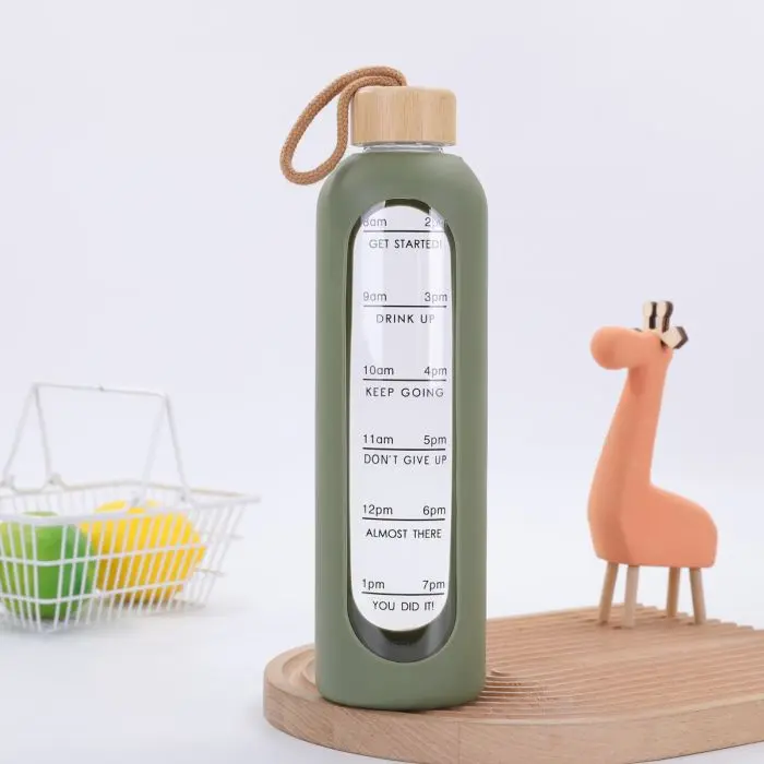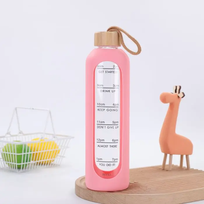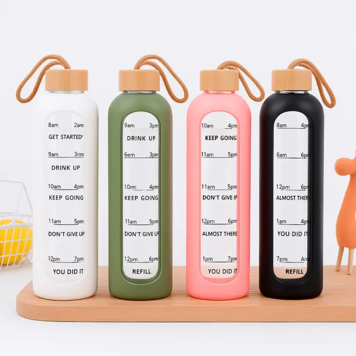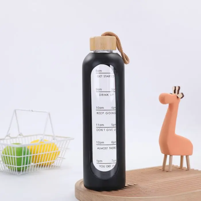 Botella de diseñoCapacidad 1000 MLMaterial: vidrio c/funda siliconaColores negro, blanco, verde, rosa.Se envían surtidos.